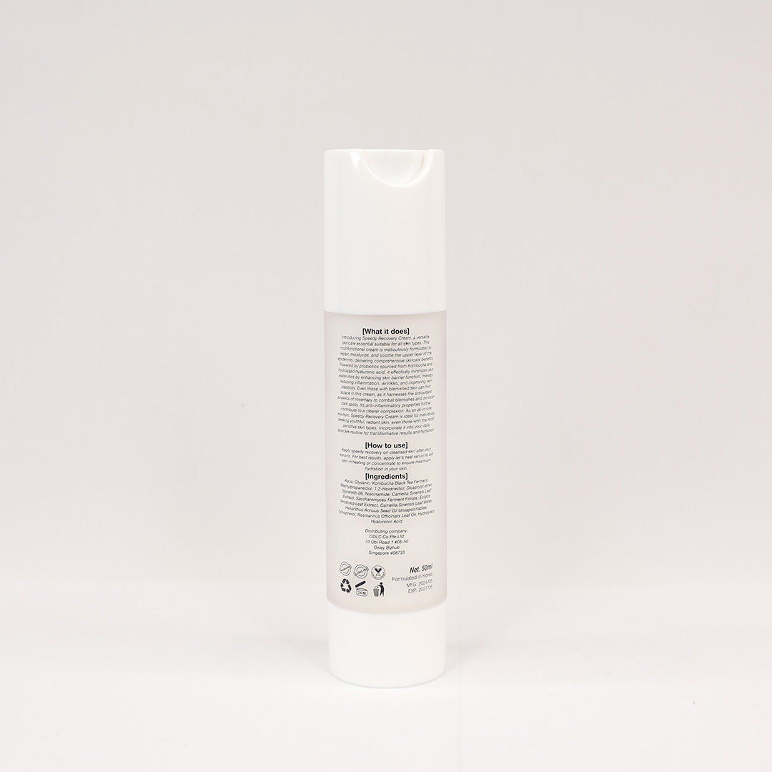 Introducing Speedy Recovery Cream, a versatile skincare essential suitable for all skin types. This multifunctional cream is meticulously formulated to repair, moisturize, and soothe the upper layer of the epidermis, delivering comprehensive skincare benefits. Powered by probiotics sourced from Kombucha and hydrolyzed hyaluronic acid, it effectively minimizes skin water-loss by enhancing skin barrier function, thereby reducing inflammation, wrinkles, and improving skin elasticity. Even those with blemished skin can find solace in this cream, as it harnesses the antioxidant prowess of rosemary to combat blemishes and diminish dark spots. Its anti-inflammatory properties further contribute to a clearer complexion. As an all-in-one solution, Speedy Recovery Cream is ideal for individuals seeking youthful, radiant skin, even those with the most sensitive skin types. Incorporate it into your daily skincare routine for transformative results and hydration.